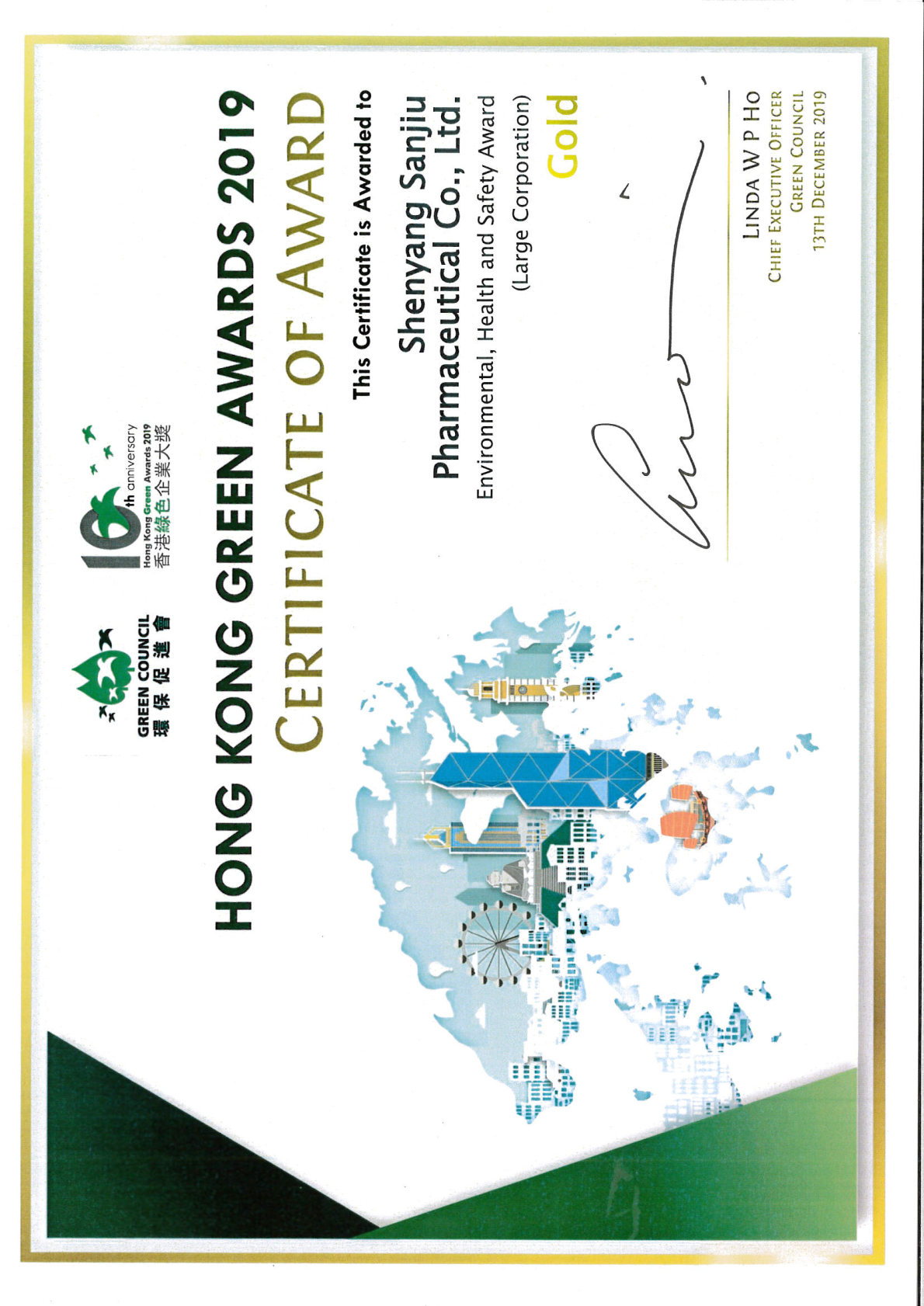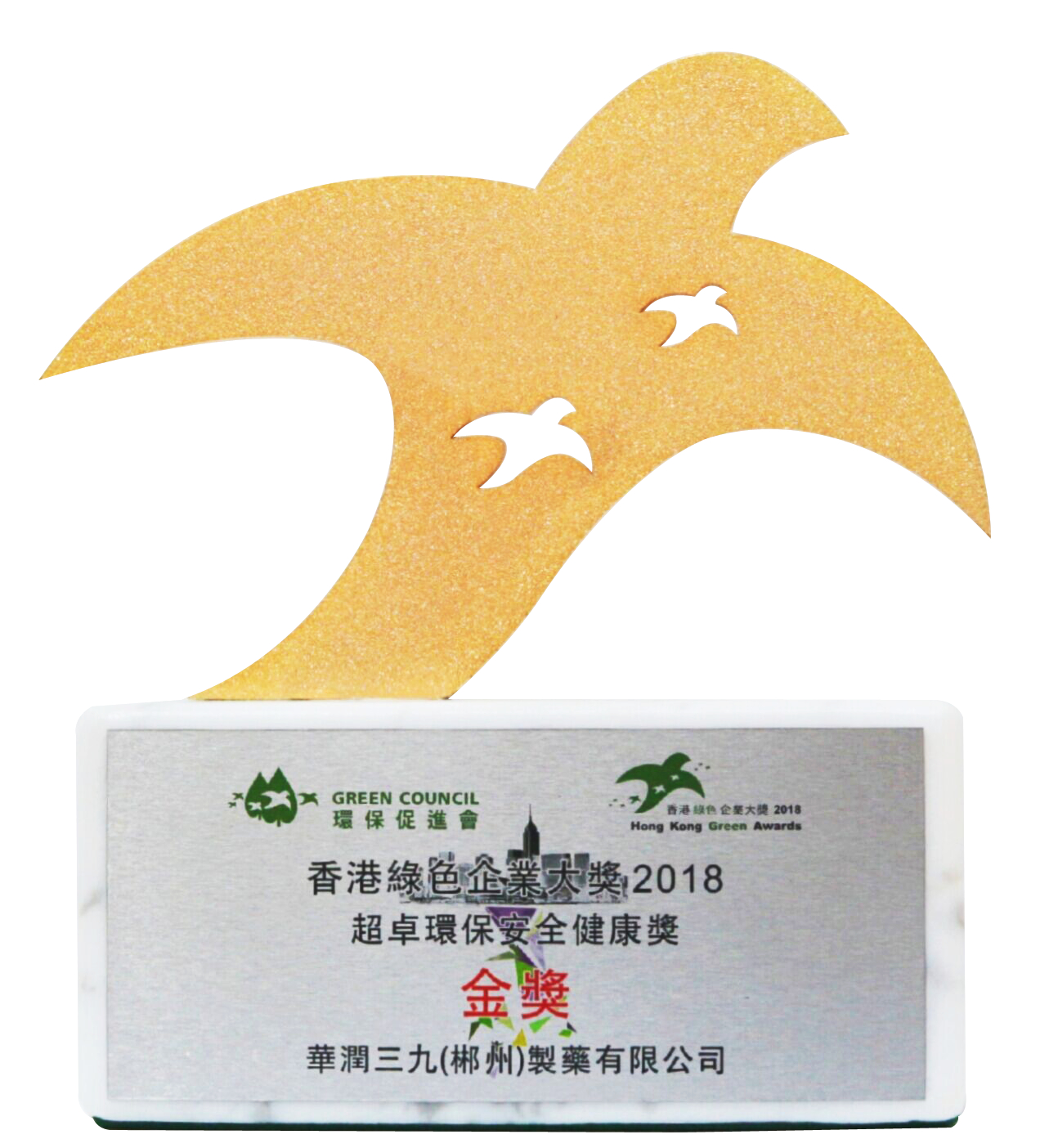 2019年12月 ,沈阳三九荣获香港环保增进会“香港绿色企业大奖-超卓环保清静康健奖”金奖。